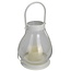 Lantaarn met LED-kaars Een glazen lantaarn met metalen frame. Op de bodem een kaars met LED-lampje. Aan/Uit schakelaar aan de onderzi...