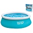 Eenvoudig op te zetten zwembad, pomp lucht in de opblaasbare rand, vul het bad met water en het zwembad zal vanzelf rechtop gaan staan naarmate er meer water in stroomt.